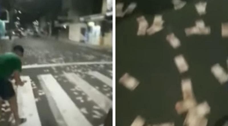 Em um vídeo que circula nas redes sociais, é possível ouvir as pessoas gritando pelas ruas “Deus é bom” e “estou rico” enquanto pegavam as notas espalhadas pelo chão.