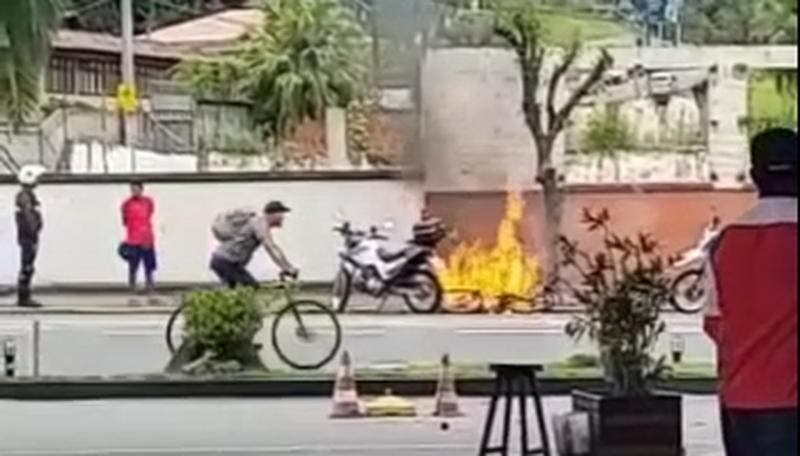 Um homem ateou fogo no próprio veículo na tarde desta quinta-feira (11) em Indaial, no Vale do Itajaí. Segundo a Diretoria de Trânsito da cidade, o ataque de fúria ocorreu após ele ser flagrado empinando uma bicicleta motorizada e ser informado de que a mesma seria recolhida pelo guincho por falta de documentação.