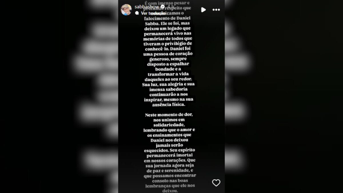 “É com imenso pesar e profundo respeito que comunicamos o falecimento de Daniel Sabbá. Ele se foi, mas deixou um legado que permanecerá vivo nas memórias de todos que tiveram o privilégio de conhecê-lo. Daniel foi uma pessoa de coração generoso, sempre disposto a espalhar bondade e a transformar a vida daqueles ao seu redor”.