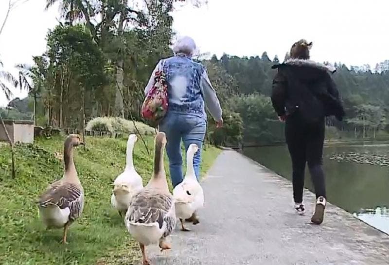 Avó e neta adestraram gansos e fazem caminhadas diárias por um parque em Jaraguá do Sul, no Norte de SC. A aposentada Ilca Meier e a estudante Valentine Meier passeiam com os animais de estimação todas as manhãs por um trajeto que dura aproximadamente 45 minutos.