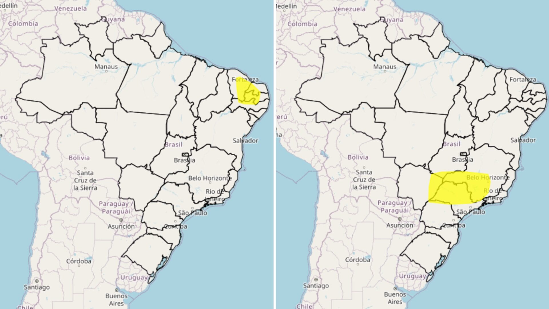 Em seguida, aparece o Rio Grande do Norte. As três regiões cobertas pelo alerta amarelo do Inmet formam praticamente o estado inteiro, excluindo apenas a faixa litorânea de Natal e adjacências, como o Leste Potiguar. Já em Pernambuco, as duas regiões em alerta cobrem a maior parte do território fora da área metropolitana do Recife.