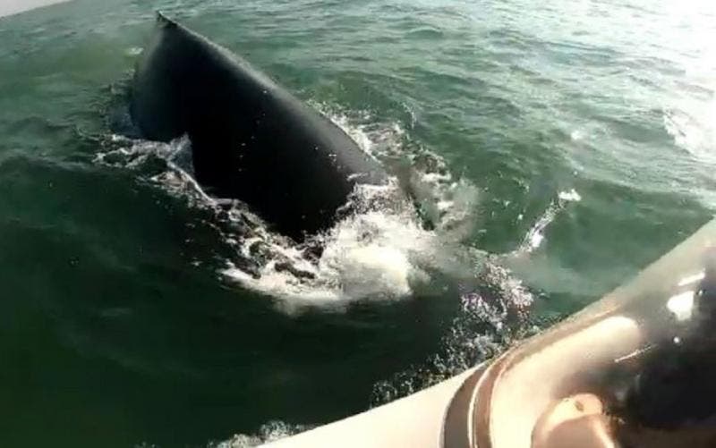 Um grupo de amigos foi surpreendido por uma baleia, que passou a poucos metros da embarcação em que estavam em Balneário Barra do Sul, no Norte de SC, no último domingo (25).