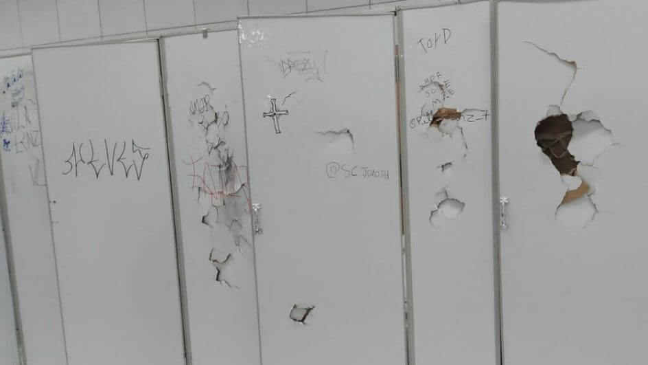 Banheiros masculinos da Arena Jaraguá foram depredados na última segunda-feira (1º). O local está na parte externa do ginásio, utilizado por toda comunidade. Nas imagens, é possível ver portas amassadas, quebradas e pichadas.