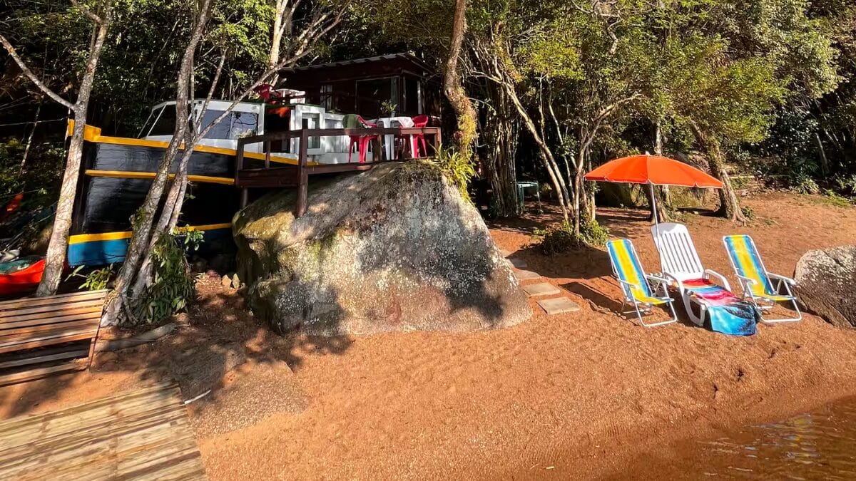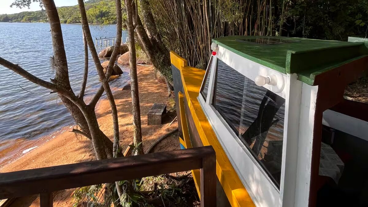Já imaginou dormir dentro de um barco, mas em terra firme? Essa experiência pouco comum à beira da Lagoa Conceição, em Florianópolis, é oferecida através de uma “casa-barco” disponível para aluguel de temporada.