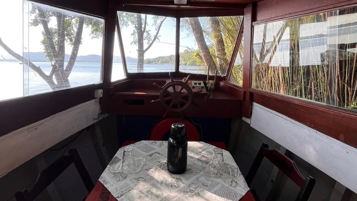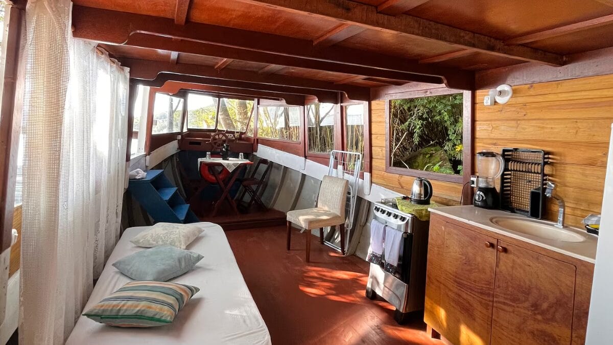 O acesso limitado torna o local ainda mais especial, com uma imersão total na natureza. Mas o grande charme fica por conta da estrutura da hospedagem, construída em um barco histórico. Quarto, banheiro, cozinha, tudo fica dentro da embarcação adaptada.