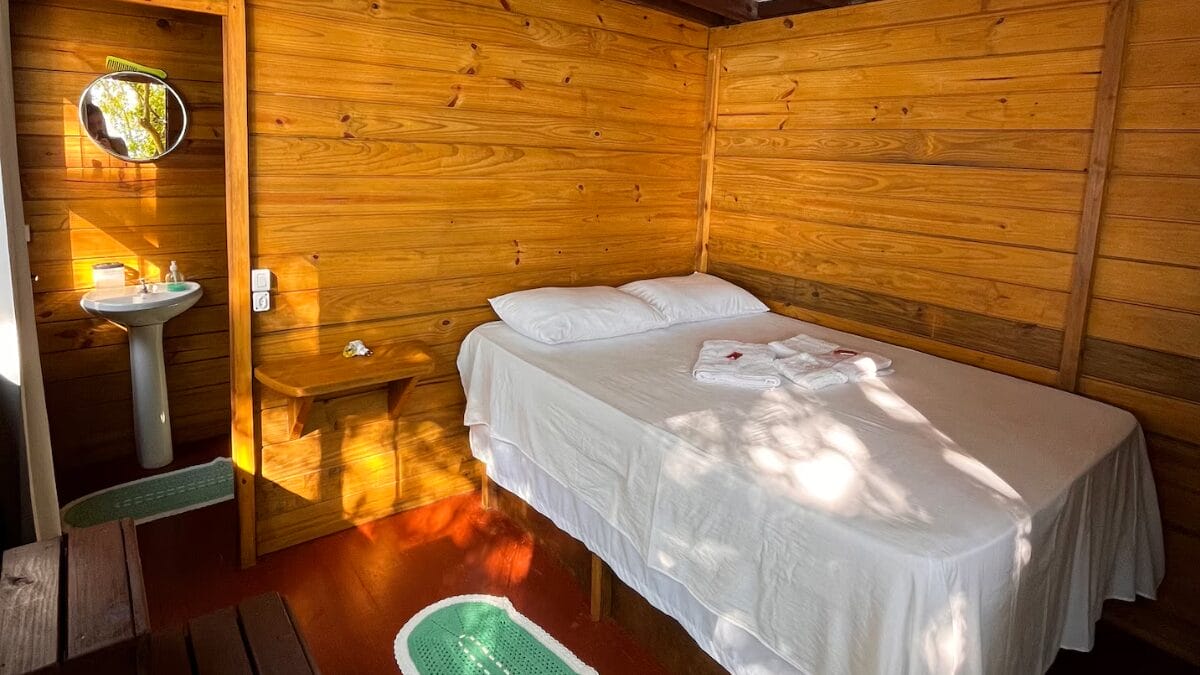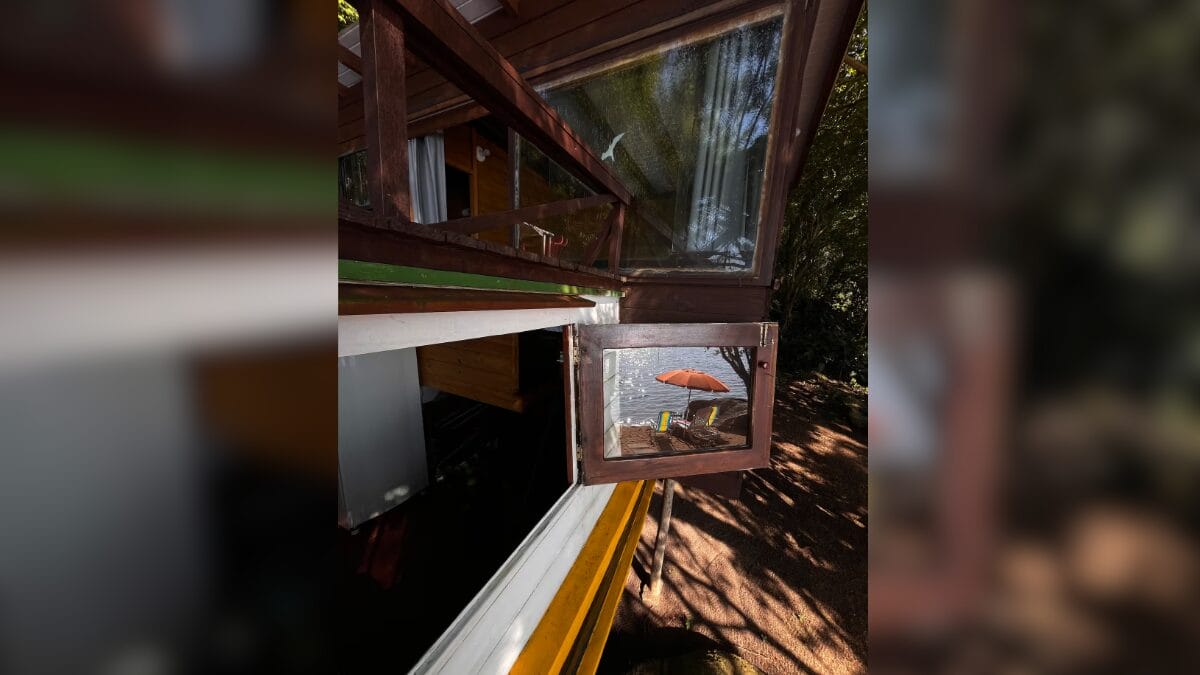 O Airbnb conta com duas camas e um banheiro completo, com capacidade para três hóspedes. Tem ainda uma cozinha equipada e um deck externo com vista para a lagoa. Os hóspedes podem desfrutar de uma praia privativa, com stand-up e caiaque à disposição.