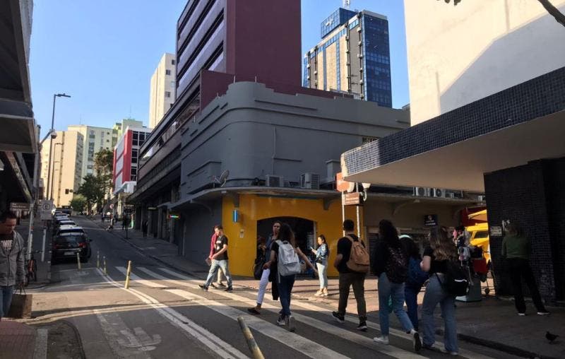 O primeiro acionamento aconteceu às 11h54, quando dois assaltantes entraram em uma loja de celulares, na esquina entre a Rua Álvaro de Carvalho e a Felipe Schmidt.