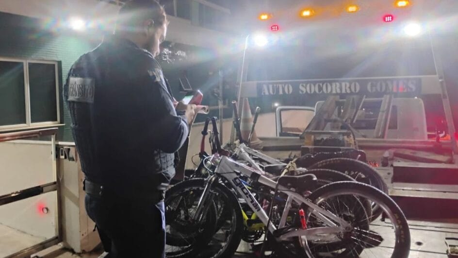 Cinco bicicletas foram removidas ao pátio pelos agentes de trânsito de Balneário Camboriú após ciclistas terem realizado manobras perigosas na Estrada da Rainha, na noite de sábado (2).