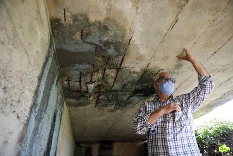 Algumas ferragens da ponte já estão à mostra. O especialista explica que o recomendado é ao menos três centímetros de concreto cobrindo a armadura. É que quanto exposta, a ferragem oxida e expande rompendo o concreto. A corrosão de armaduras é um dos fatores que levam a queda de pontes. Em primeiro lugar está o problema com fundação.