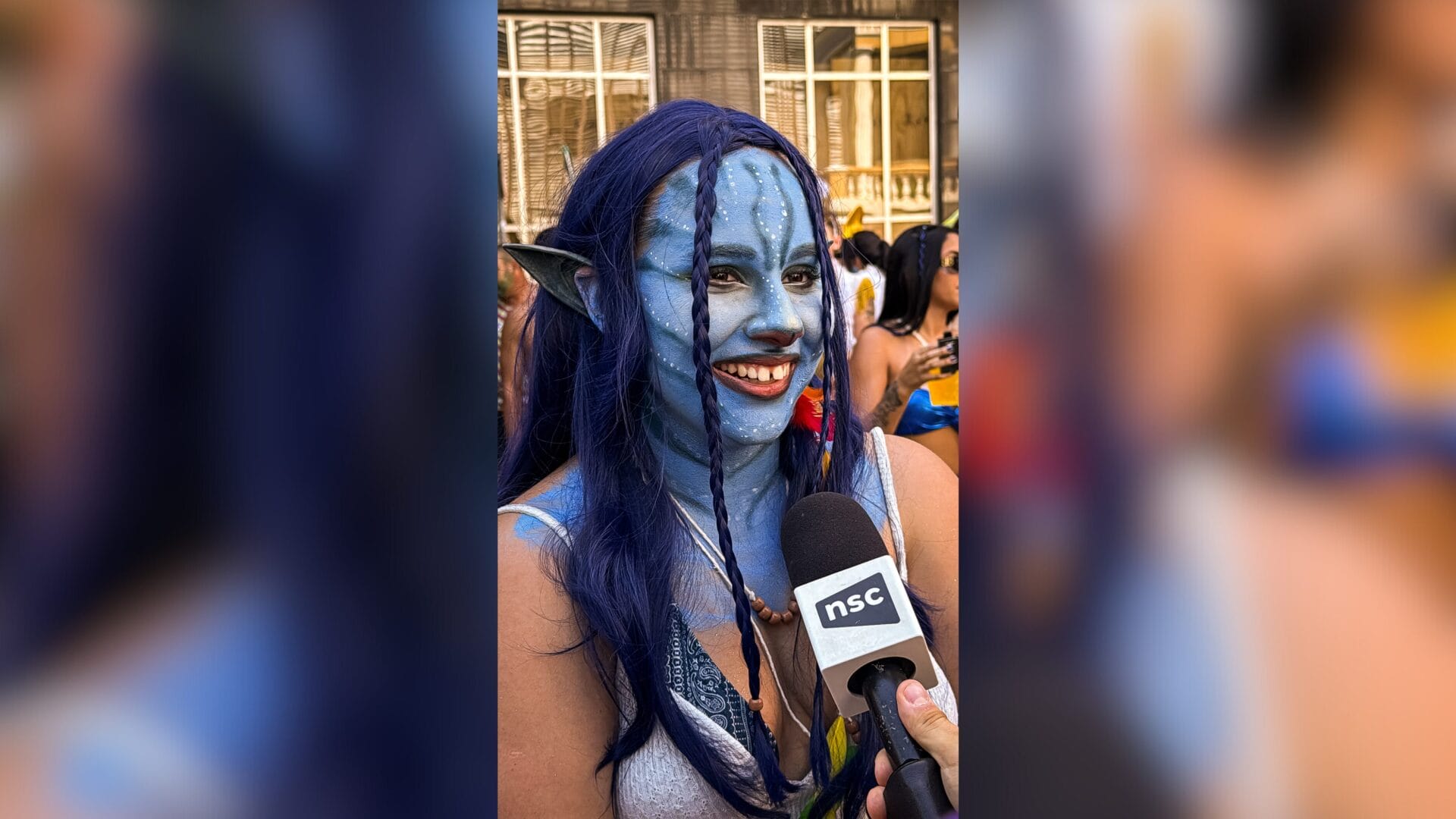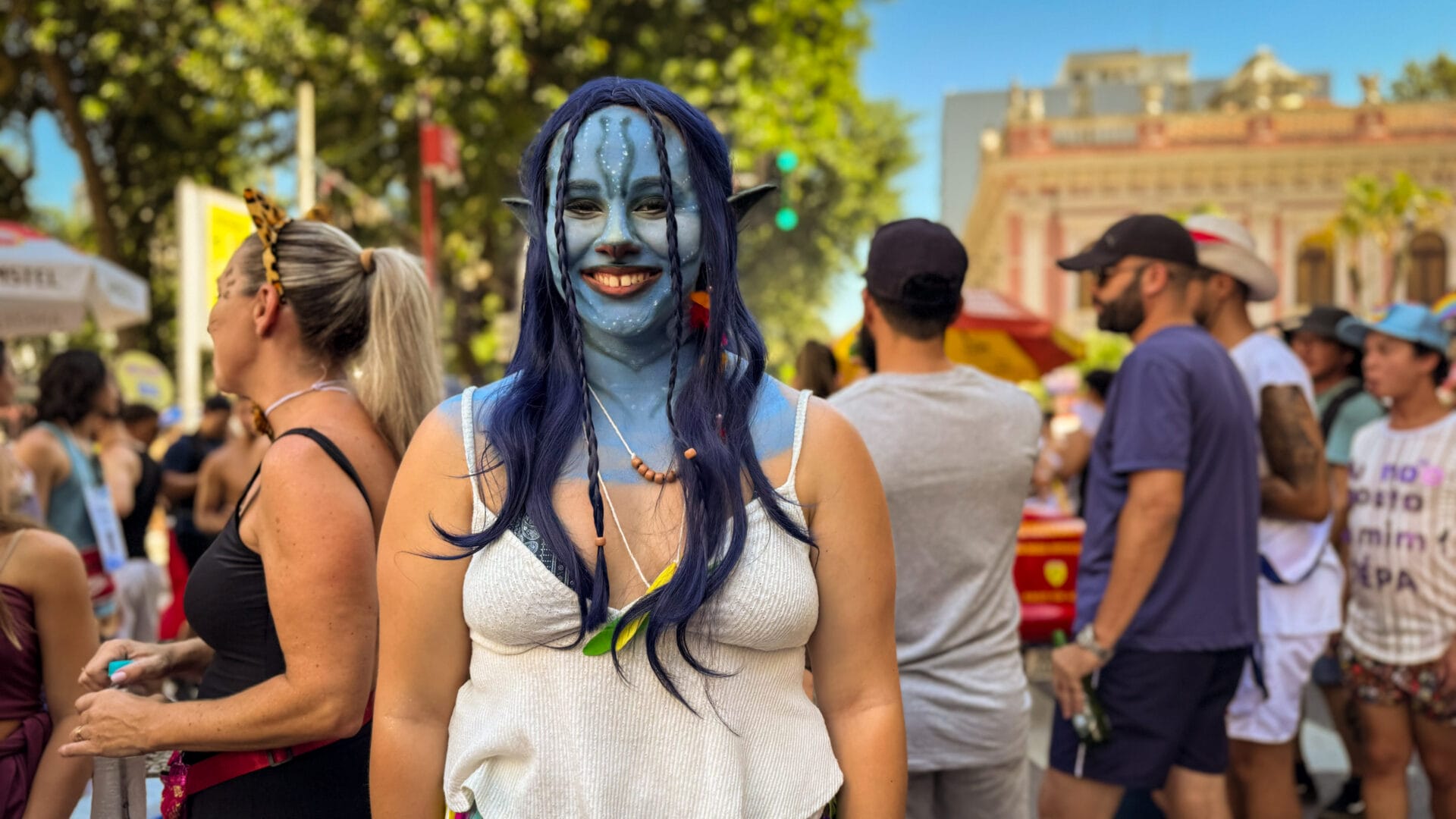 Além do kit de sobrevivência, a folia da Capital no segundo dia de Carnaval 2025 ficou marcada por fantasias inusitadas, como a de Luiza Corrales Mori, de 15 anos, que acordou às 4h30min para se produzir do personagem do filme “Avatar”.