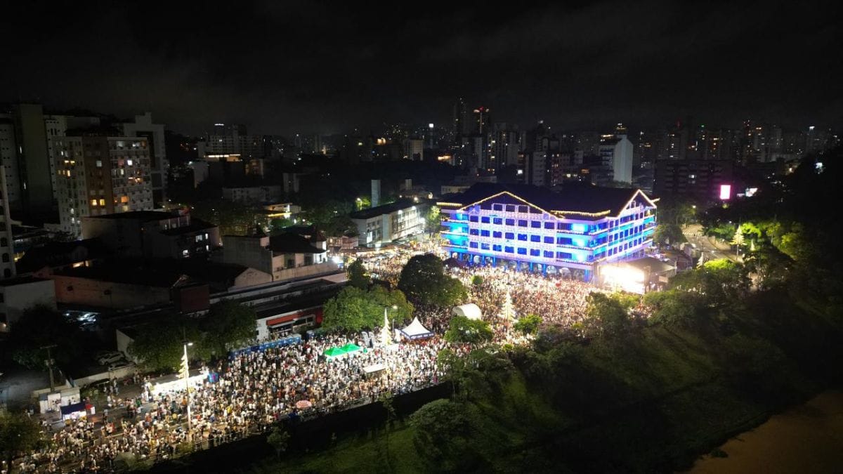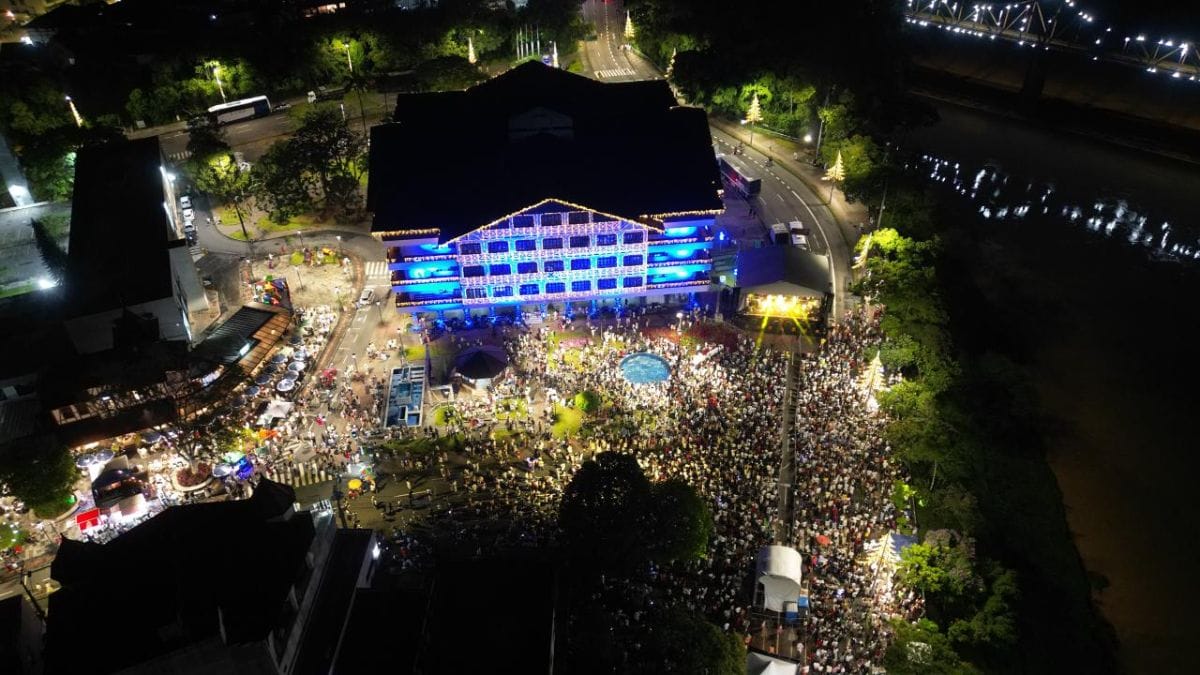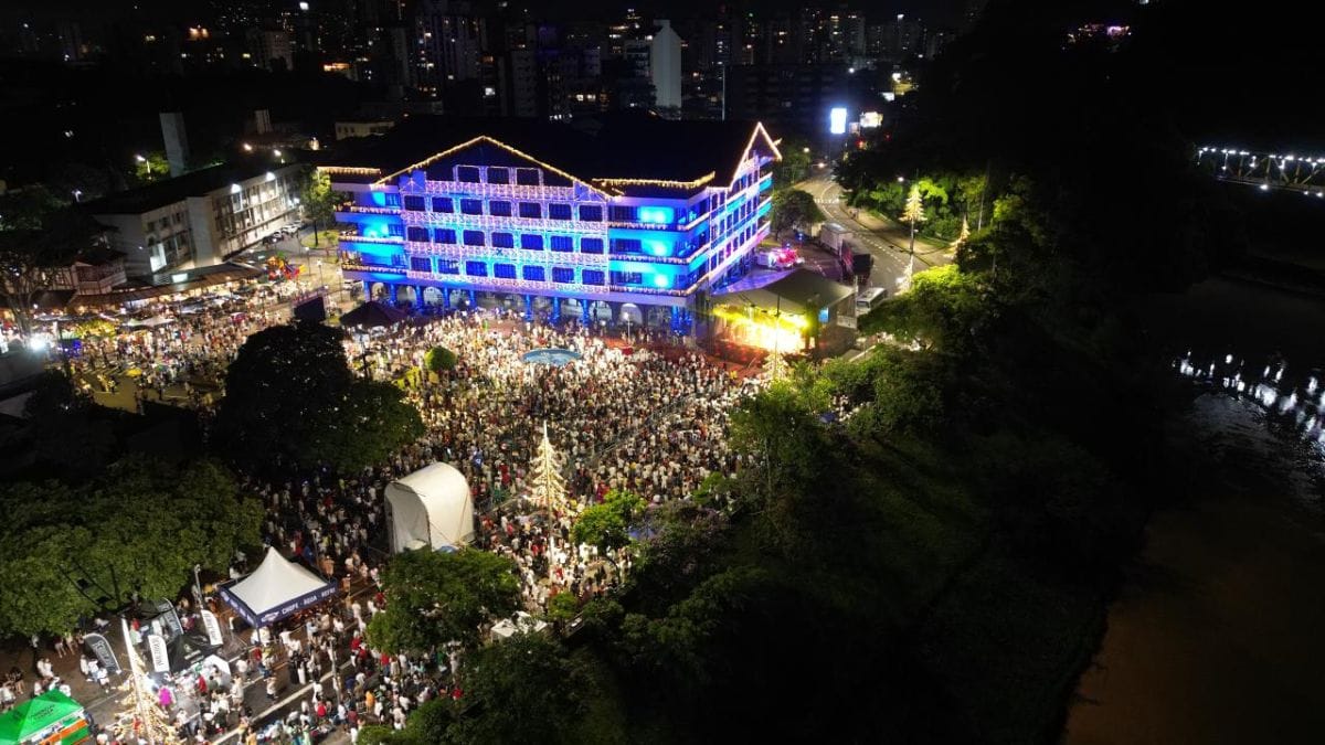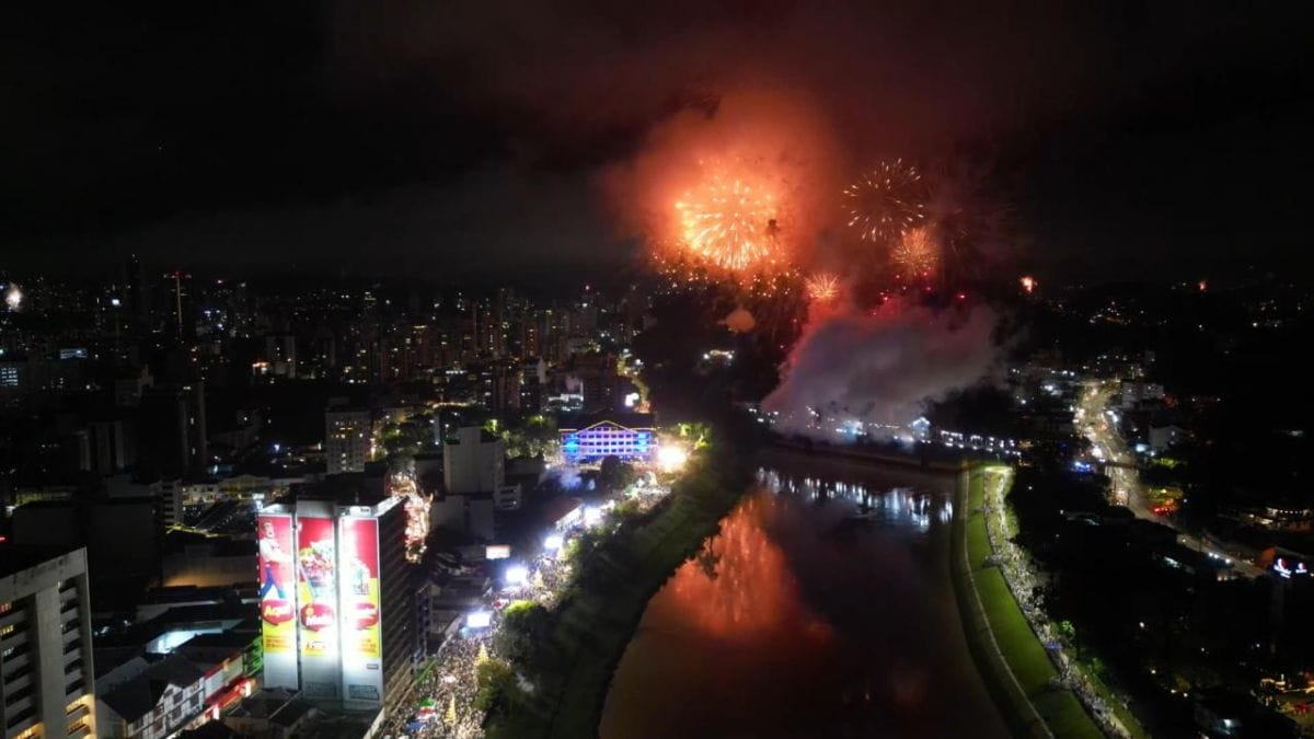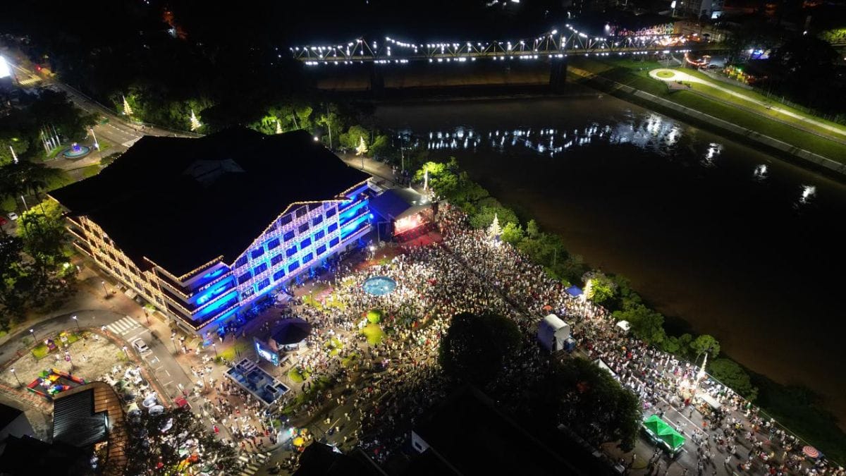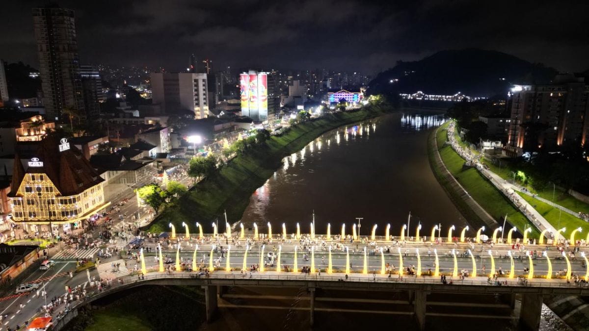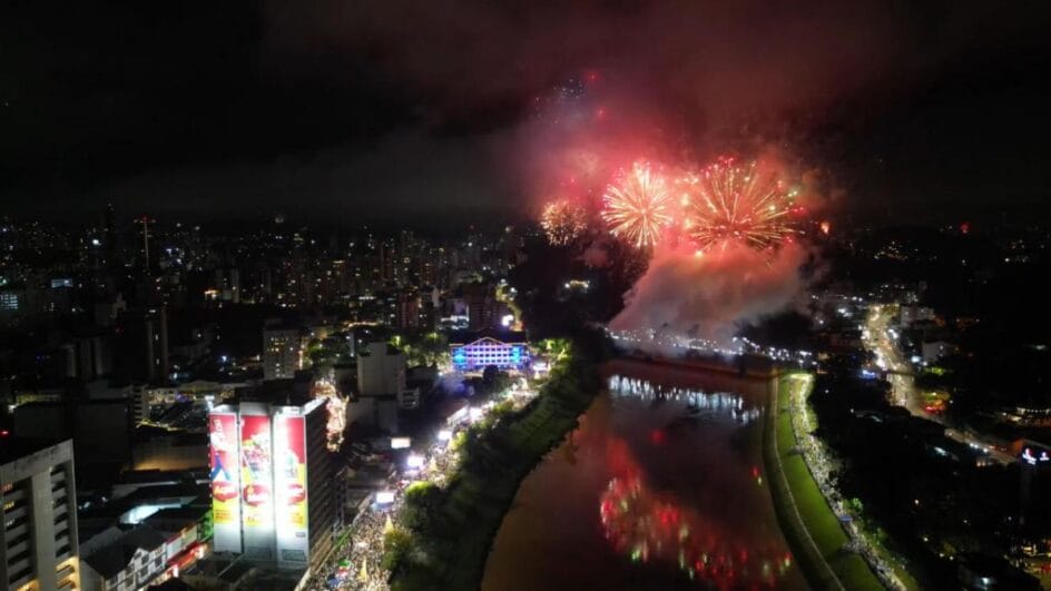 O relógio marcava 23h59min do dia 31 de dezembro de 2025 quando a contagem regressiva começou a ser reverberada pela multidão no Centro de Blumenau. Quando os ponteiros finalmente marcaram meia-noite, já era um novo ano, e a população gritou em comemoração, ao mesmo tempo em que baterias posicionadas no Frohsinn, na Ponte de Ferro e no Museu da Água lançavam os fogos de artifício para anunciar a chegada de 2026.