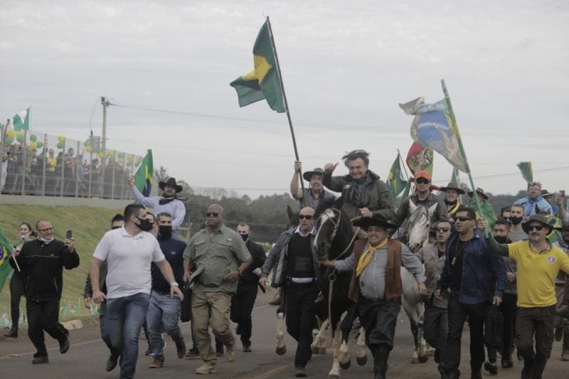O presidente Jair Bolsonaro chegou cavalgando ao Distrito Industrial de Chapecó na manhã deste sábado (26), de onde partiu para uma motociata com apoiadores em SC. Alguns correram ao redor do cavalo na tentativa de se aproximar do presidente, que estava cercado de seguranças e policiais.