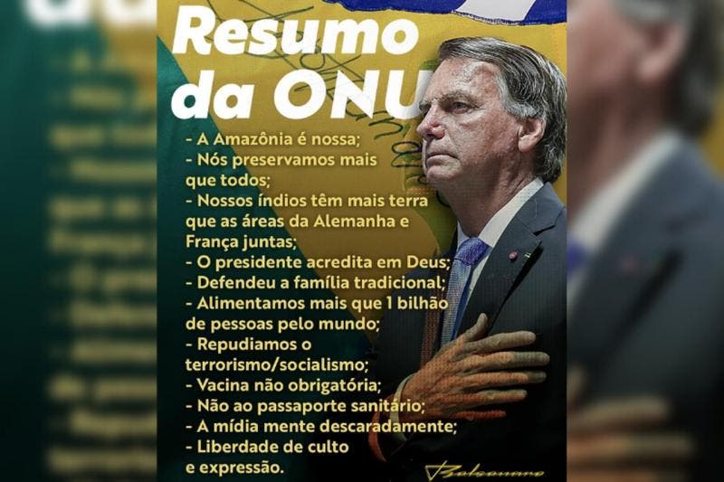 Em foto publicada em sua conta pessoal do Twitter, o presidente Jair Bolsonaro aparece com seis dedos. A publicação é um resumo de sua fala no discurso de abertura da 76ª Assembleia Geral da Organização das Nações Unidas.
