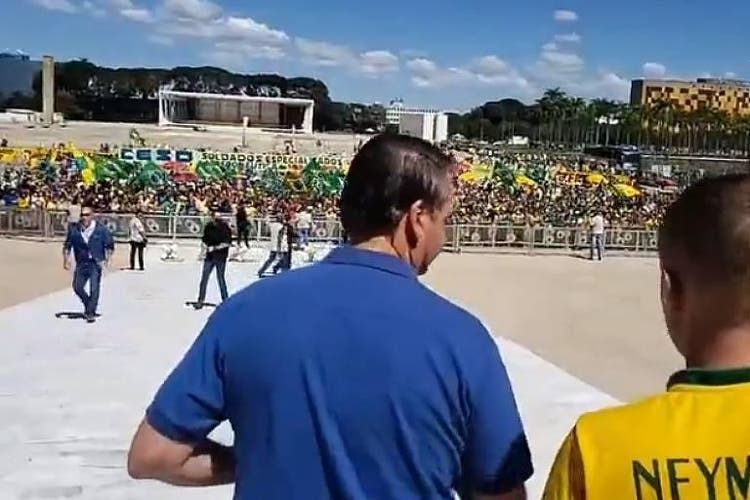 Bolsonaro deixou o Palácio da Alvorada neste domingo (3) e foi até a rampa do Planalto para acenar aos manifestantes, aglomerados, que gritavam "Fora Maia", entre outras coisas.
