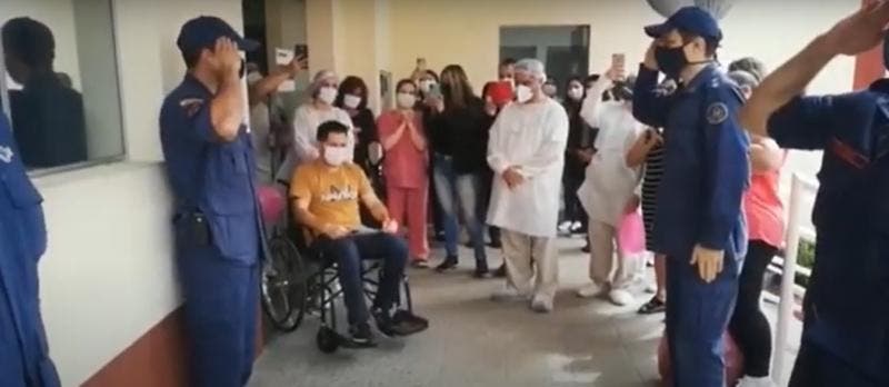 Nas imagens, 10 colegas de Heger aparecem enfileirados na parte externa da unidade de saúde. Quando o cabo aparece na porta do hospital, é aplaudido pelos bombeiros. Em seguida, o grupo presta continência para o colega.