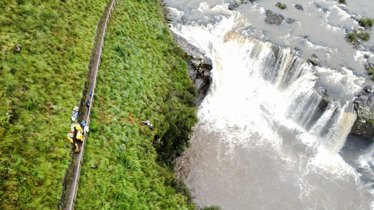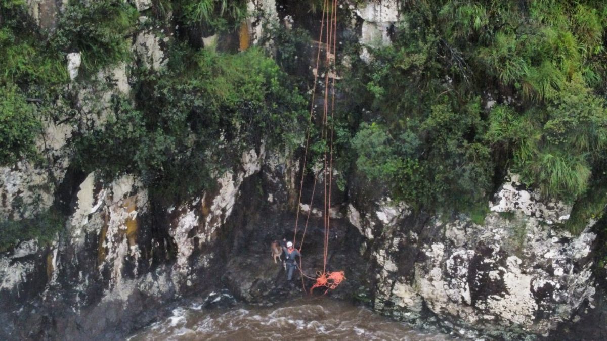 O cão Apolo estava desaparecido há dois dias e foi resgatado numa altura de 30 metros, próximo à queda d’água.