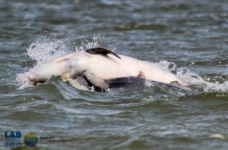 Um boto foi visto carregando o corpo de um filhote morto em Laguna, no Sul de SC na quarta-feira (29). O comportamento de “despedida” é raro, segundo o Projeto de Monitoramento de Praias da Bacia de Santos (PMP-BS/Udesc).