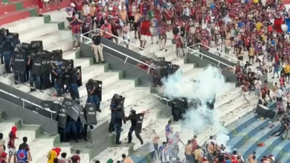 As imagens mostram confronto entre torcedores e a polícia, que encontrou muita dificuldade para controlar a confusão. Foi preciso o uso de balas de borracha e gás lacrimogênio para dispersão. É possível ver, em determinado momento, um policial caído e carregado por colegas e pessoas com a camisa do Cerro.