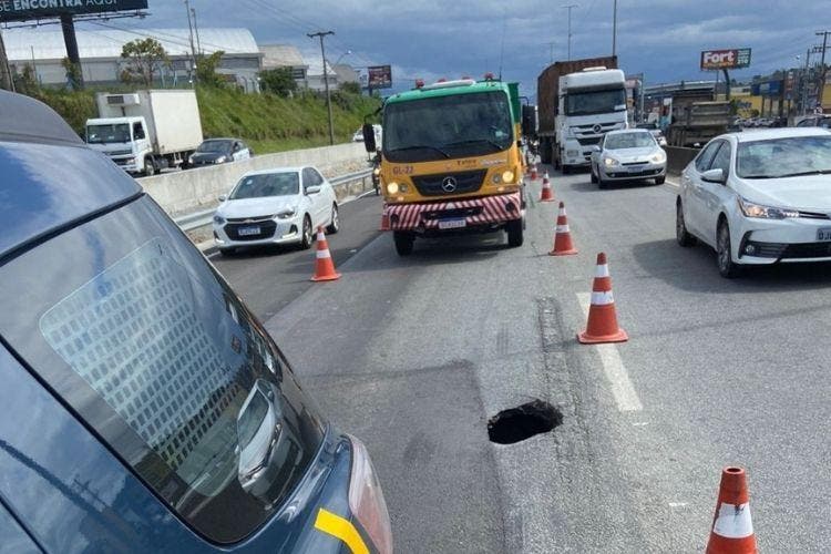 O asfalto cedeu e formou um buraco no Km 209 da BR-101, em São José, na Grande Florianópolis, na tarde desta terça-feira (19). Até as 13h30min as faixas 2 e 3 da rodovia estavam completamente bloqueadas. A interrupção fica antes do trevo de Forquilhas.