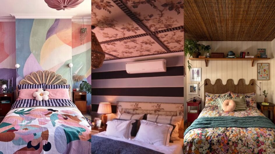 Já quem prefere o boho contemporâneo, pode gostar da cabeceira do quarto da influenciadora digital Julie Choi. Cores e muita ousadia com pinturas orgânicas na parede em cores nos mesmos tons das roupas de cama. Uma cabeceira de fibra natural é o toque que une a parede e a cama e unifica a decoração.