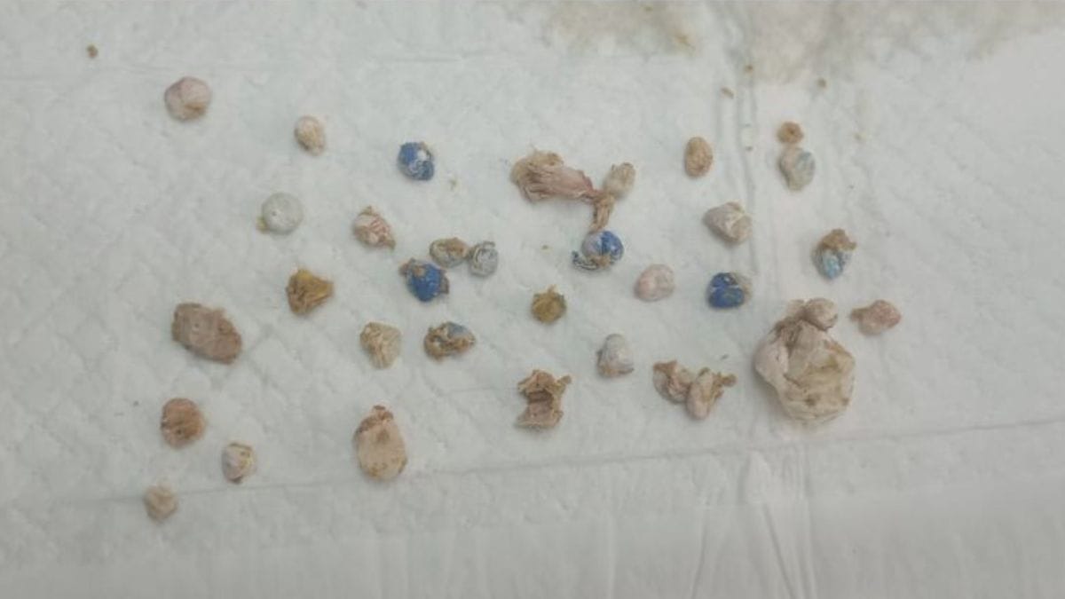 Um atendimento inicial foi feito por uma médica veterinária, que suspeitou do caso de intoxicação. Conforme a clínica, o relato dos tutores foi crucial para descobrir que o animal havia ingerido um material inusitado: 55 pedras de crack.