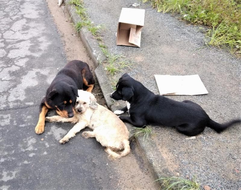Um cachorro ficou sob os cuidados de outros dois cães após ser atropelado na manhã deste sábado (18) em Blumenau. O fato chamou a atenção de agentes da Guarda Municipal de Trânsito (GMT) que foram acionados para atender essa ocorrência. Os dois animais permaneceram por todo o tempo com o ferido “como se estivessem o acolhendo”, relata o guarda que esteve no local.