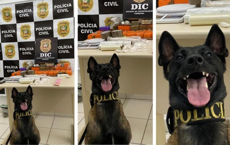 Orelha em pé, olhos bem abertos e língua para fora. Foi com essa expressão que um cachorro da Polícia Civil de Joinville saiu na foto após um dia de trabalho. O cão ajudou na apreensão de drogas no bairro Parque Guarani e identificou substâncias ilícitas em um carro e em uma residência nessa quinta-feira (8).