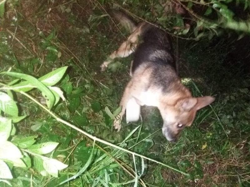 O animal foi encontrado a 20 metros de mata adentro, às margens da Estrada Geral Medeiros, preso pelo pescoço em um pedaço de corda, no tronco de uma árvore.