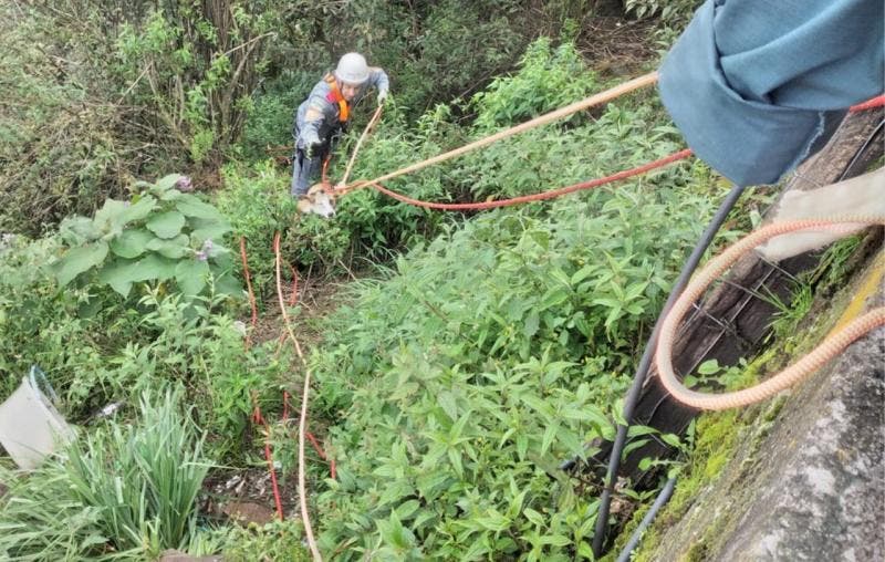 Os bombeiros isolaram a área e desceram de rapel para resgatar o animal. Uma ancoragem com fita tubular foi feita no cachorro e ele foi levado novamente para a parte segura do mirante.