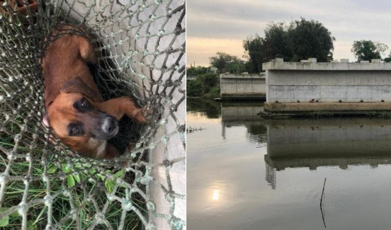 Os socorristas foram acionados logo depois das 16h por pessoas que repararam que o cão estava no local, no bairro São Judas. Para chegar até ele, a equipe usou uma pequena embarcação cedida por moradores.