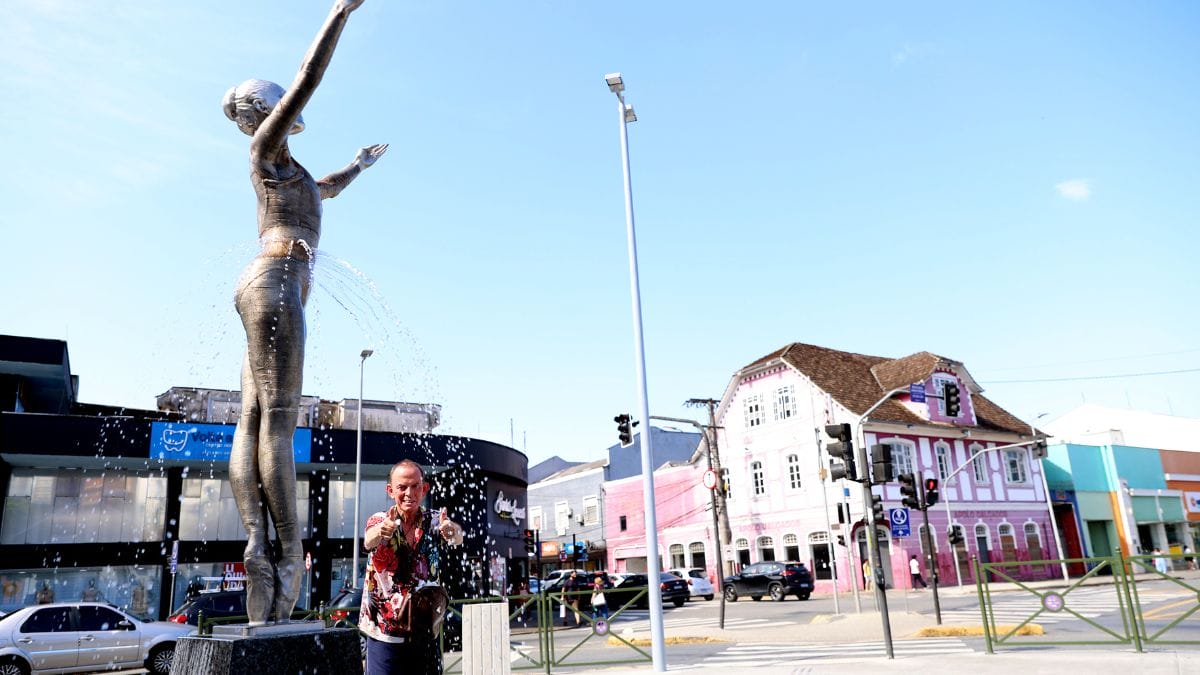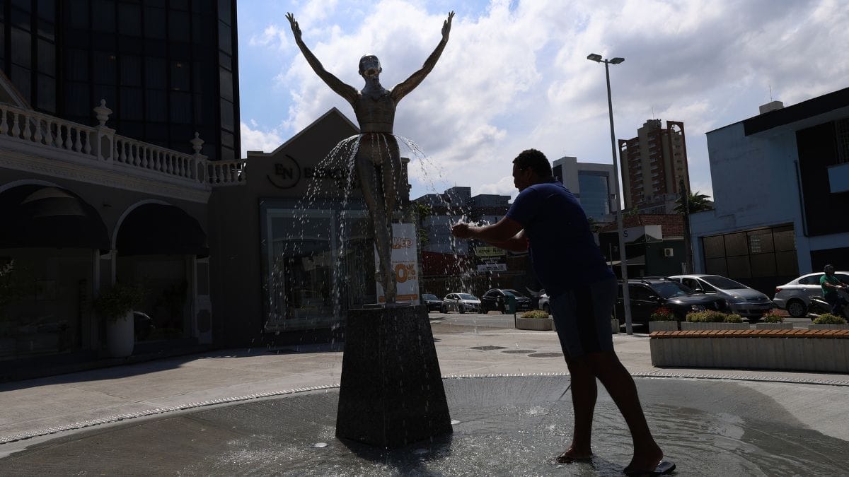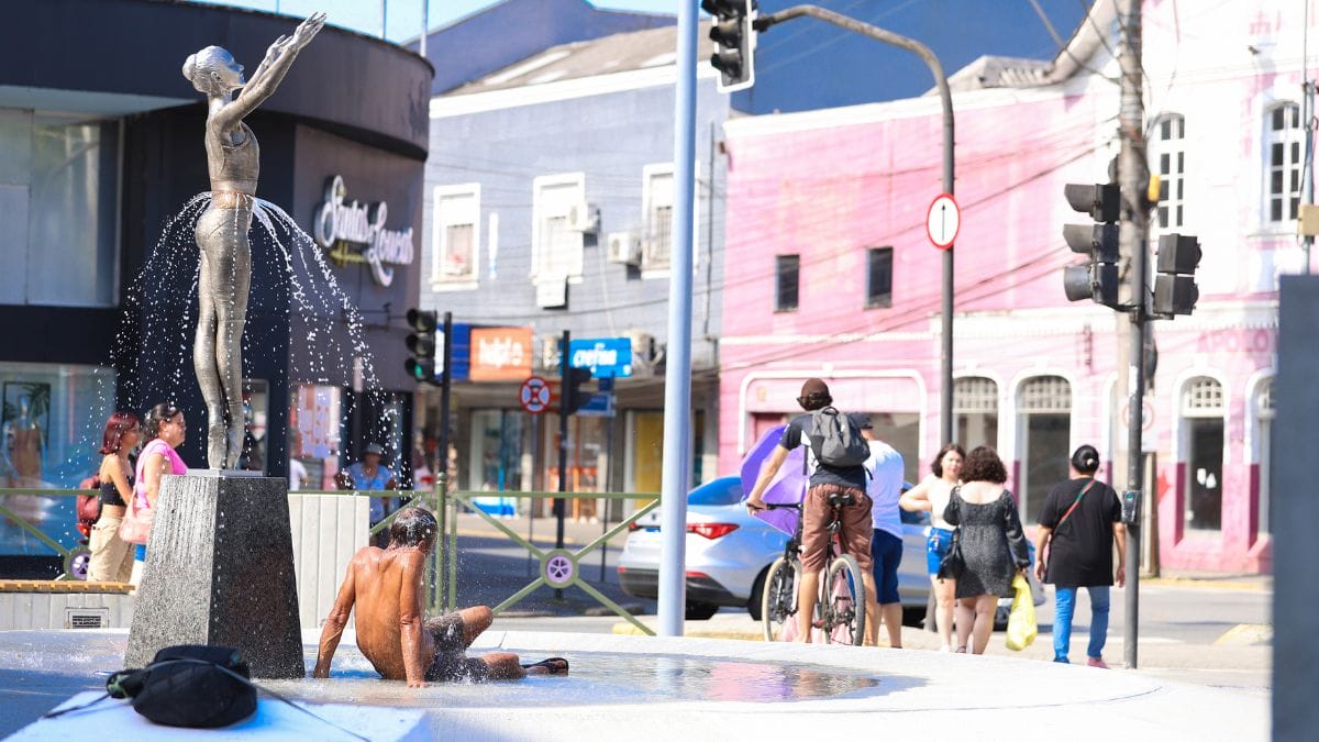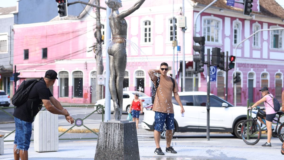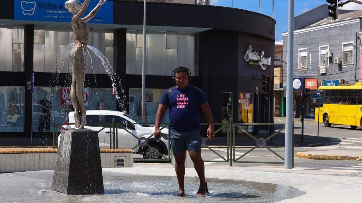 Com a temperatura na casa dos 36°C, tem quem não resista se refrescar bem na área central de Joinville. Joelson, de 24 anos, passa todos os dias na frente da recém-inaugurada estátua da bailarina no cruzamento da Avenida Juscelino Kubitschek com a Rua 9 de Março. No caminho para o trabalho, ele não perde a oportunidade de molhar os pés no chafariz.