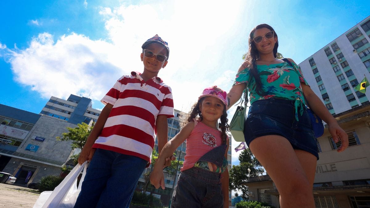 Com crianças, o cuidado precisa ser ainda maior. Equislaine, de 23 anos, foi ao centro da cidade com a missão de comprar o material escolar de seus dois filhos. Para isso, o protetor solar e os bonés se tornaram importantes aliados. Além disso, também não pode faltar a garrafa de água gelada para manter os pequenos bem hidratados durante a caminhada.
