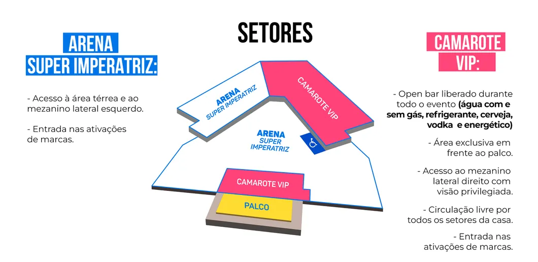 A planta do evento é dividida em dois setores principais: Arena Super Imperatriz e Camarote VIP. Cada ambiente foi idealizado para atender diferentes perfis de público, com acesso a ativações de marcas, espaços instagramáveis e fácil circulação. A abertura dos portões está prevista para as 15h.