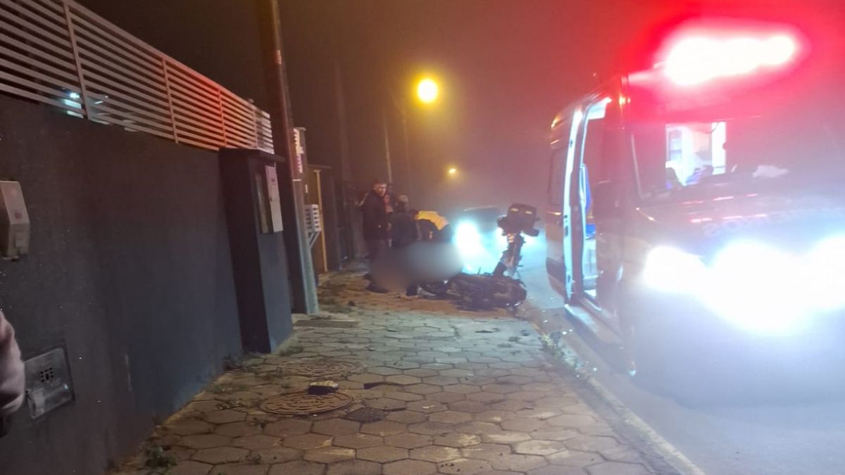 A Polícia Militar foi chamada para atender o grave acidente no bairro Schramm, por volta das 22h. Quando os policiais chegaram ao local a cena era caótica. A vítima, de 38 anos, estava ferida e havia manchas de sangue espalhadas pelo chão. A motocicleta Honda/CG sofreu danos e estava caída. Diversos detritos de veículos estavam espalhados por cerca de 50 metros na via e, logo adiante, estava o outro veículo envolvido no acidente.