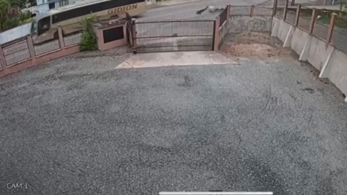 Quando o ônibus passa e atinge a fiação, o motociclista acaba arrastado pelo pescoço por alguns metros até que o motorista do veículo percebe a situação e freia imediatamente.