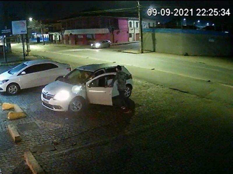 As imagens também mostram que a segunda mulher, que estava no banco do carona, se assusta com a abordagem, sai correndo e se esconde atrás de outro veículo estacionado ao lado. Enquanto isso, outro criminoso aparece na cena e entra no banco do motorista, enquanto o comparsa entra pela outra porta e eles fogem do local.