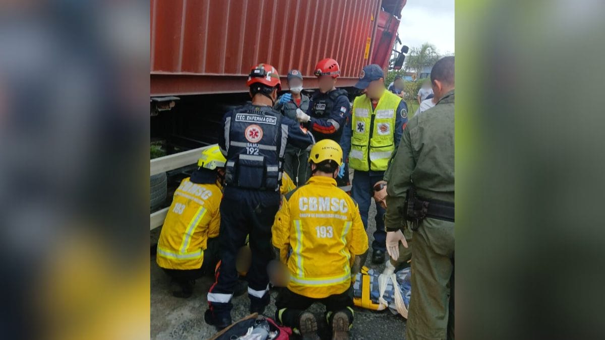 A vítima estava sob o caminhão, consciente e orientada, mas com ferimento na orelha, fratura fechada na perna direita, possível fratura em tórax e sinais de hemorragia interna.