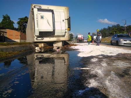 Ainda não há previsão de quando o caminhão será retirado, pois a empresa aguarda o seguro para perícia e então fazer o trasbordo da carga. Só depois será desvirado e removido o caminhão.