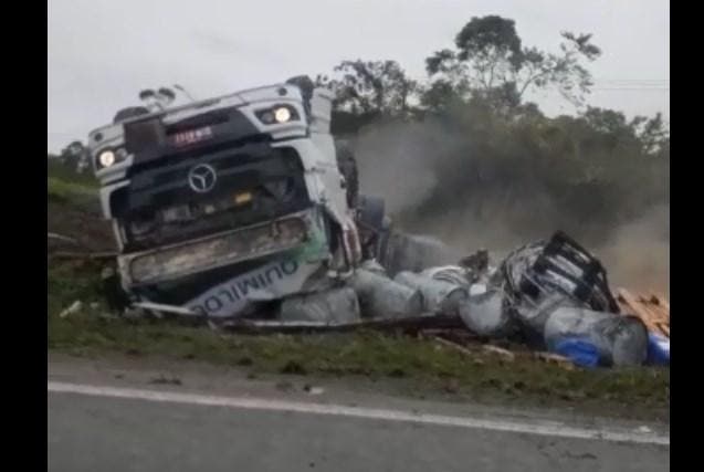 Um caminhão que carregava uma carga de produtos químicos tombou na BR-101 em Araquari, no Norte catarinense, por volta das 11h30min desta quarta-feira (11). O acidente ocorreu perto do trevo com a BR-280, no sentido Joinville da rodovia.