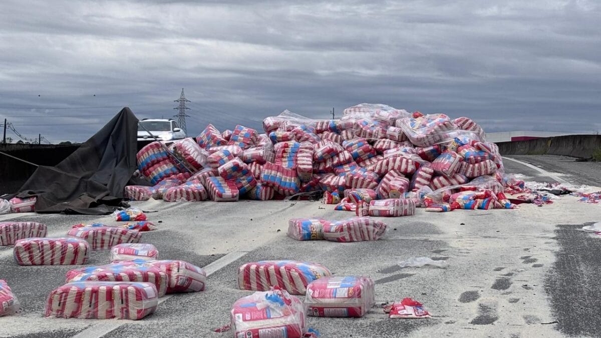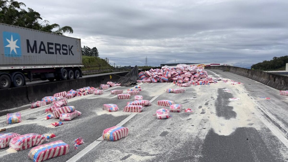 Uma carreta carregada de arroz tombou na BR-101, no trecho que passa por Araquari, na manhã desta segunda-feira (19). Com o tombamento, o veículo e a carga, que ficou sobre o chão, fecharam as duas pistas da rodovia no Km 62. O acidente ocorreu por volta das 4h40min.