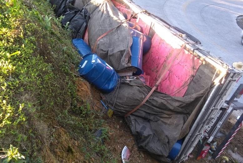 O caminhão descia a serra no sentido Joinville e, segundo o relato do motorista à Polícia Militar Rodoviária (PMRv), ficou sem freio e acabou se perdendo na curva. Ele tombou e bateu contra o barranco. O motorista não se feriu.