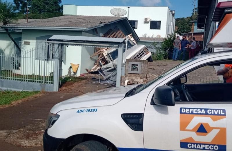 Um caminhão desgovernado atingiu uma casa em Chapecó, no Oeste de Santa Catarina, e deixou os moradores assustados no início da tarde desta quarta-feira (9). O veículo não conseguiu vencer a subida e voltou de ré pela rua São Marcos, no no bairro Santa Maria. Duas pessoas estavam na residência, mas não se feriram. O motorista sofreu fraturas.
