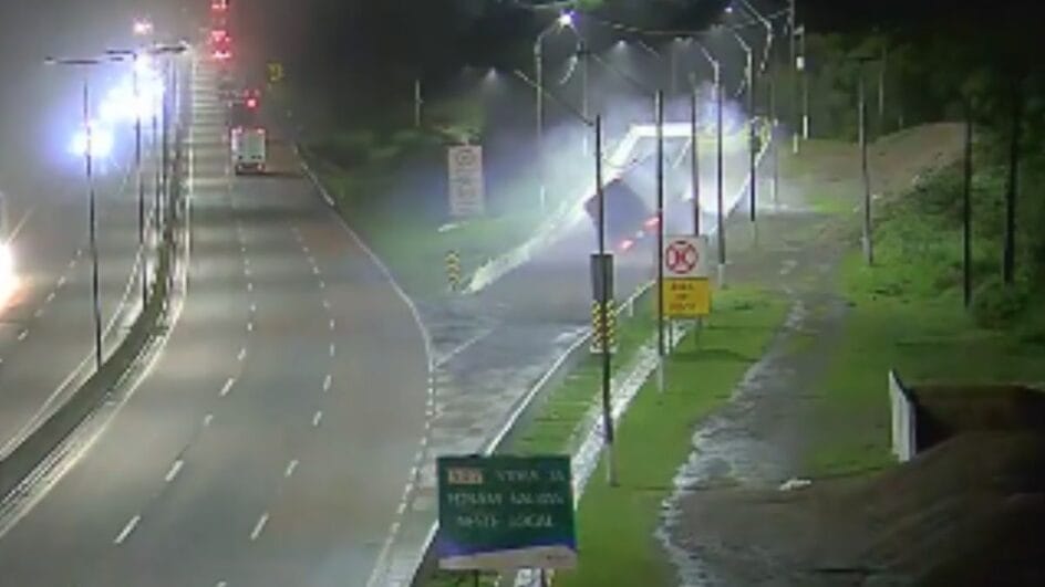 Era 4h45 quando uma câmera da Arteris Litoral Sul, concessionária que administra o trecho, flagrou a manobra do motorista no Km 671. No vídeo, é possível ver que, quando o caminhão quase tomba ao parar na área de escape.