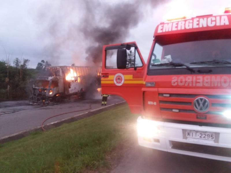 Segundos os Bombeiros Militares de Araquari, o veículo – um caminhão baú carregando cerca de 10 toneladas de tecido – já estava completamente consumido pelas chamas quando os socorristas chegaram ao local do acidente.