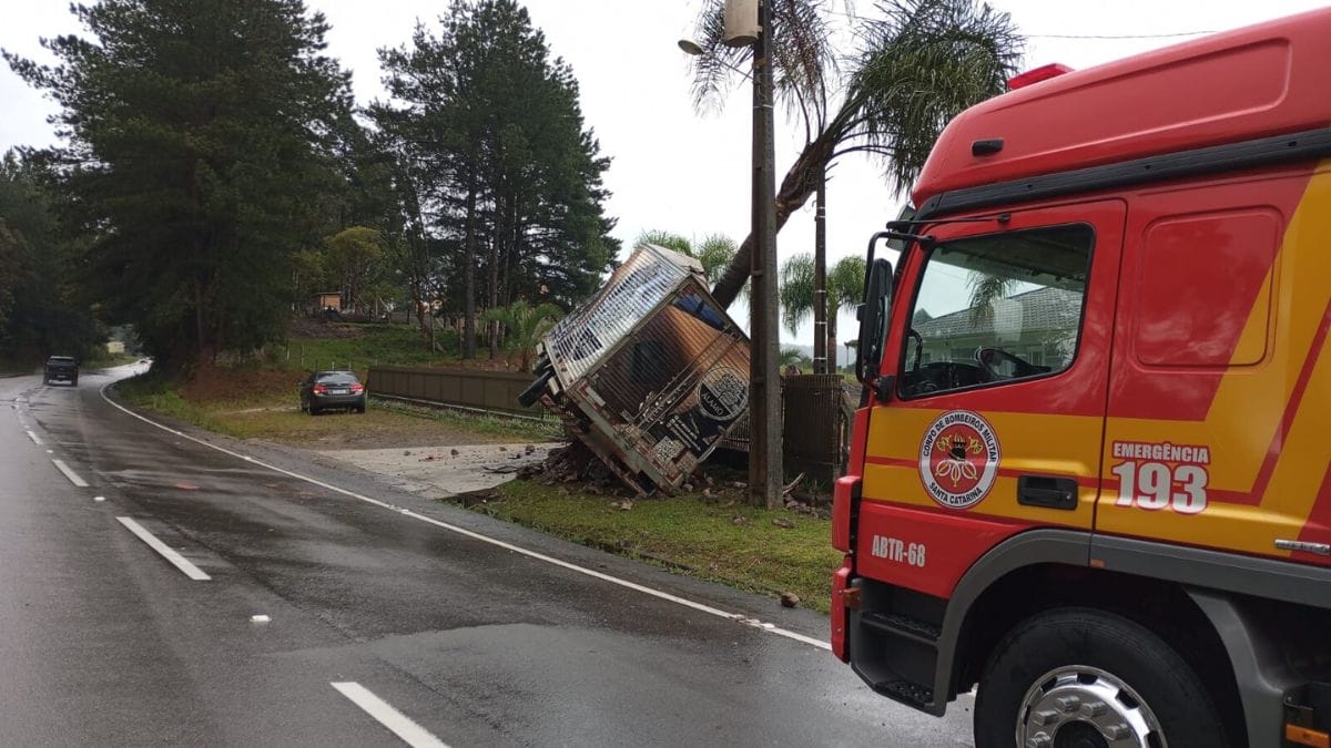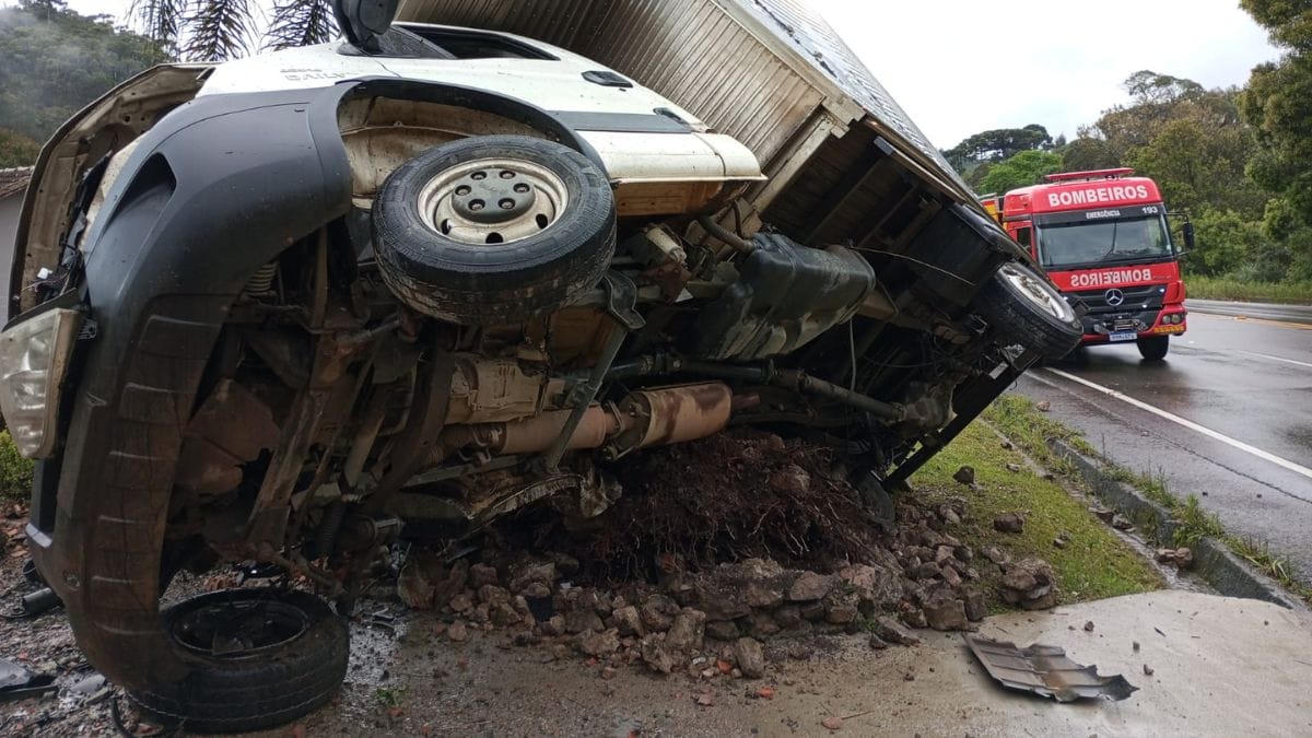O motorista contou ao Corpo de Bombeiros Militar que o veículo perdeu o controle em uma curva, o que fez com que o caminhão de pequeno porte — utilizado para transporte de cargas — tombasse lateralmente.