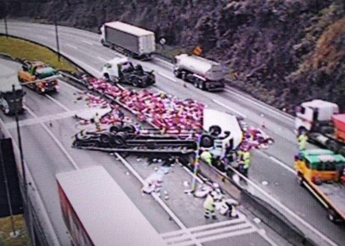 O veículo, com placas de Campinas (SP), transportava uma carga de pão de forma que, por causa do impacto, ficou espalhada sobre a pista. Por causa do acidente, as faixas nos sentidos SC e Curitiba precisaram ser interditadas pela Polícia Rodoviária Federal (PRF). A interdição gerou congestionamentos de pelo menos dois quilômetros em cada sentido.