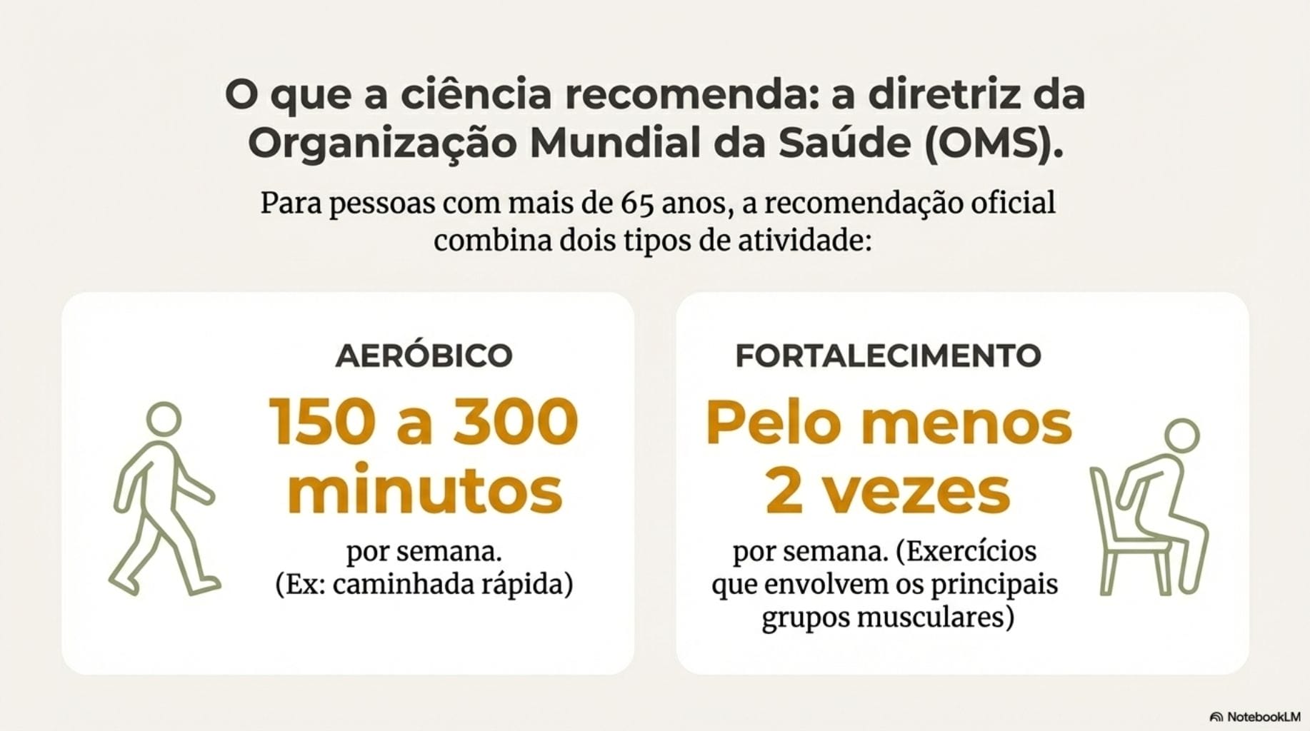 A Organização Mundial da Saúde recomenda que pessoas com mais de 65 anos realizem de 150 a 300 minutos semanais de atividades aeróbicas, como a caminhada rápida, associados a exercícios de fortalecimento muscular ao menos duas vezes por semana.