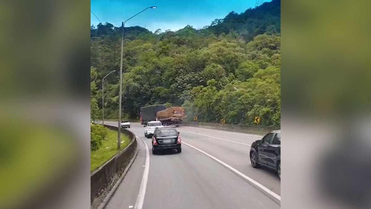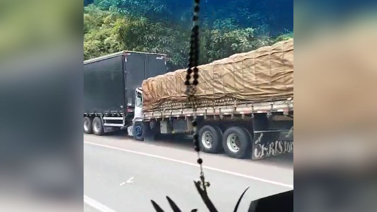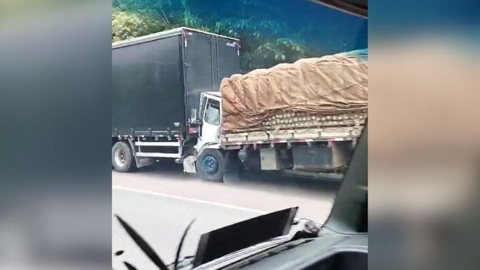 Um acidente chamou atenção de motoristas que desciam a BR-376, entre o Paraná e Santa Catarina, nesta segunda-feira (8). Dois caminhões ficaram “colados” após uma colisão traseira no Km 665 da rodovia, em Guaratuba.