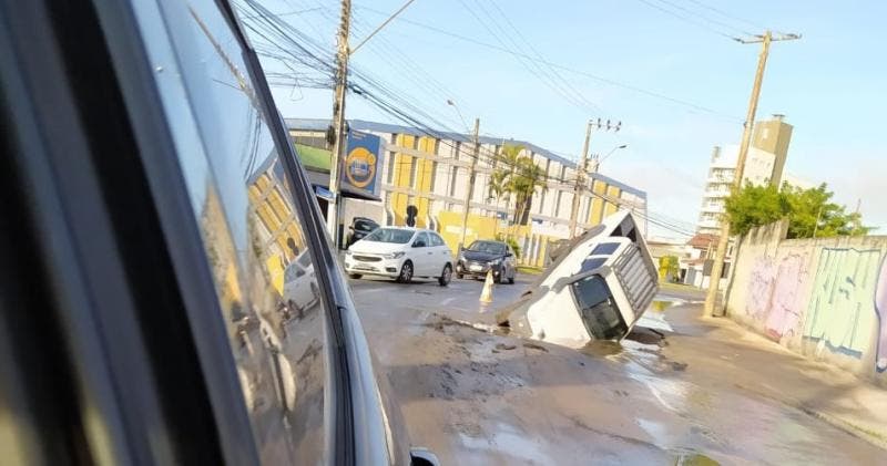Caminhonete cai em buraco após asfalto ceder por rompimento de tubulação em Itajaí.