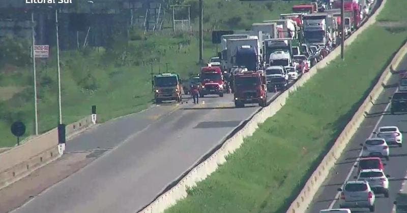 A faixa da esquerda foi liberada às 16h18min. A da direita continuava bloqueada às 17h. Os profissionais seguem lavando a pista. Não há previsão para normalização.